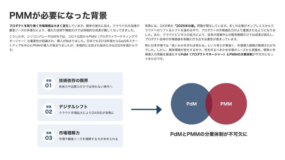 そして近年、「2025年の壁」問題が顕在化し、DX対応の必要性が改めて叫ばれる中で、PMMの役割が再認識されています。