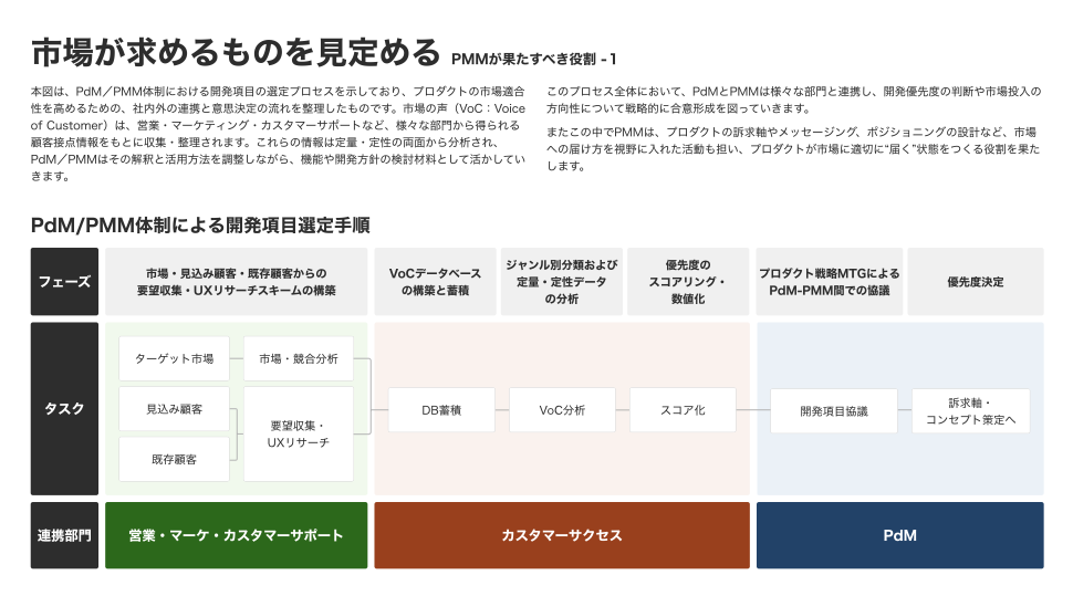 PMMは、市場が求めるものを見極め、それを言語化し、市場に受け入れられる状態を作り出すという、非常に重要なプロセスを担います。