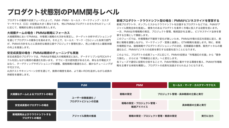 - 成熟したプロダクト: PMMは戦略策定に重点を置きます。